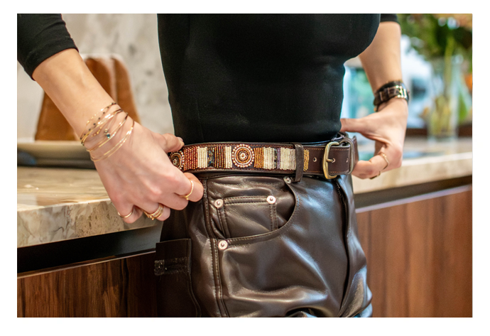 Nos ceintures en cuir et perles sont dessinées par nos soins et réalisées à la main selon une méthode ancestrale Maasaï. Un savoir-faire qui se transmet de génération en génération. Chaque pièce est unique et comporte la touche personnelle de sa créatrice.